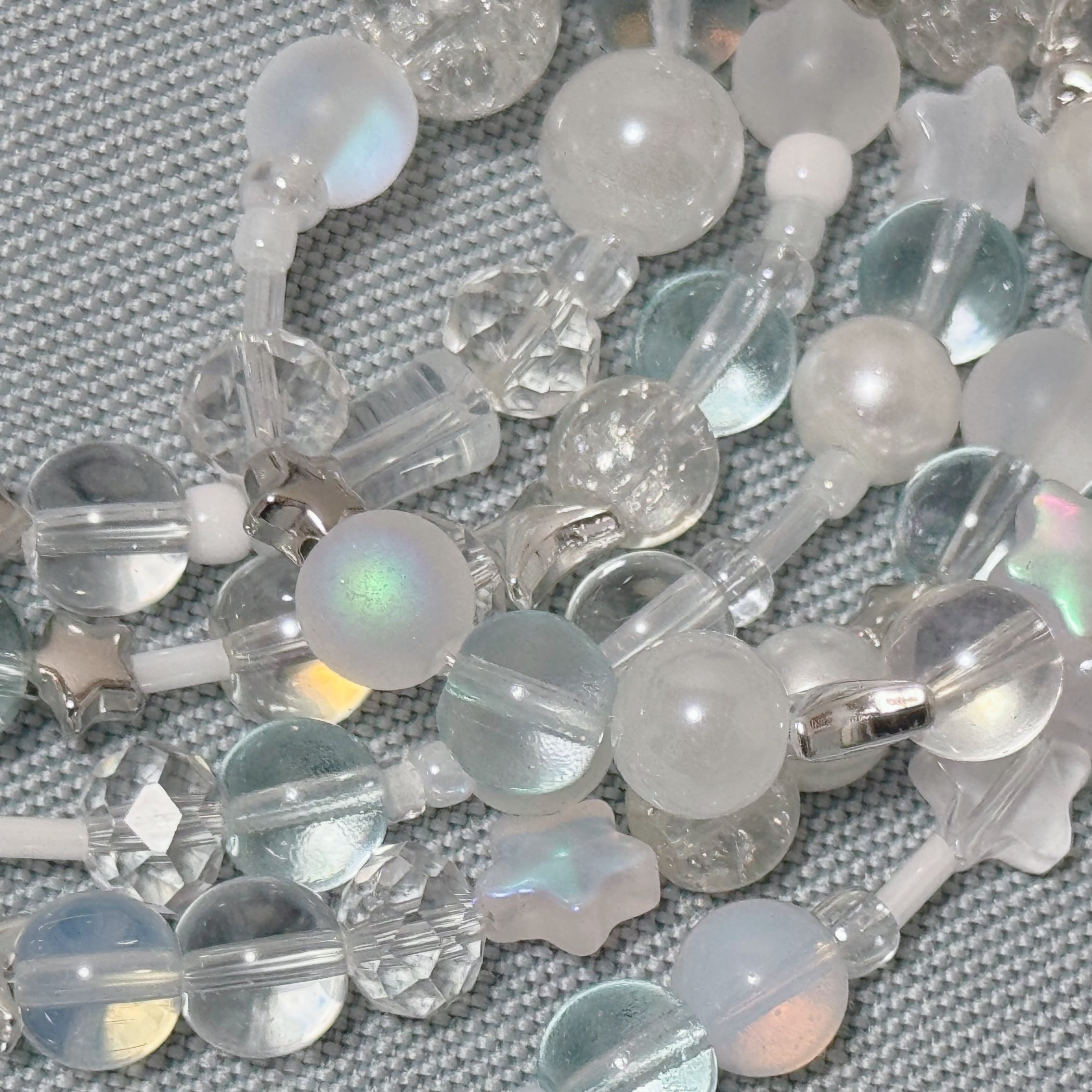 静謐なライトブルーとムーンストーンのようなビーズなど、心を落ち着けられるお守りになってほしいと祈りを込めながら作りました。どれひとつとして同じものはありませんので、手に取った瞬間、あなただけのものになります。